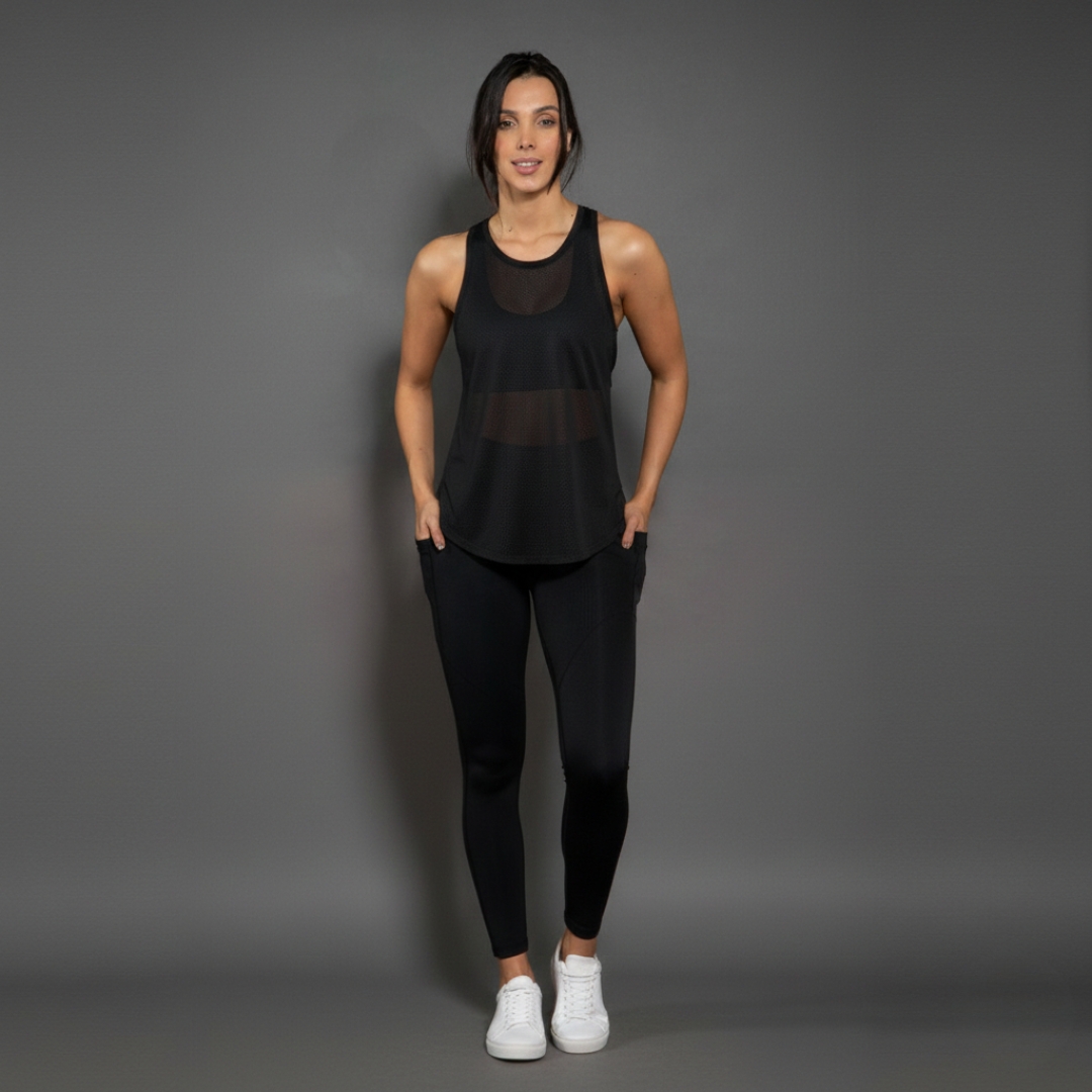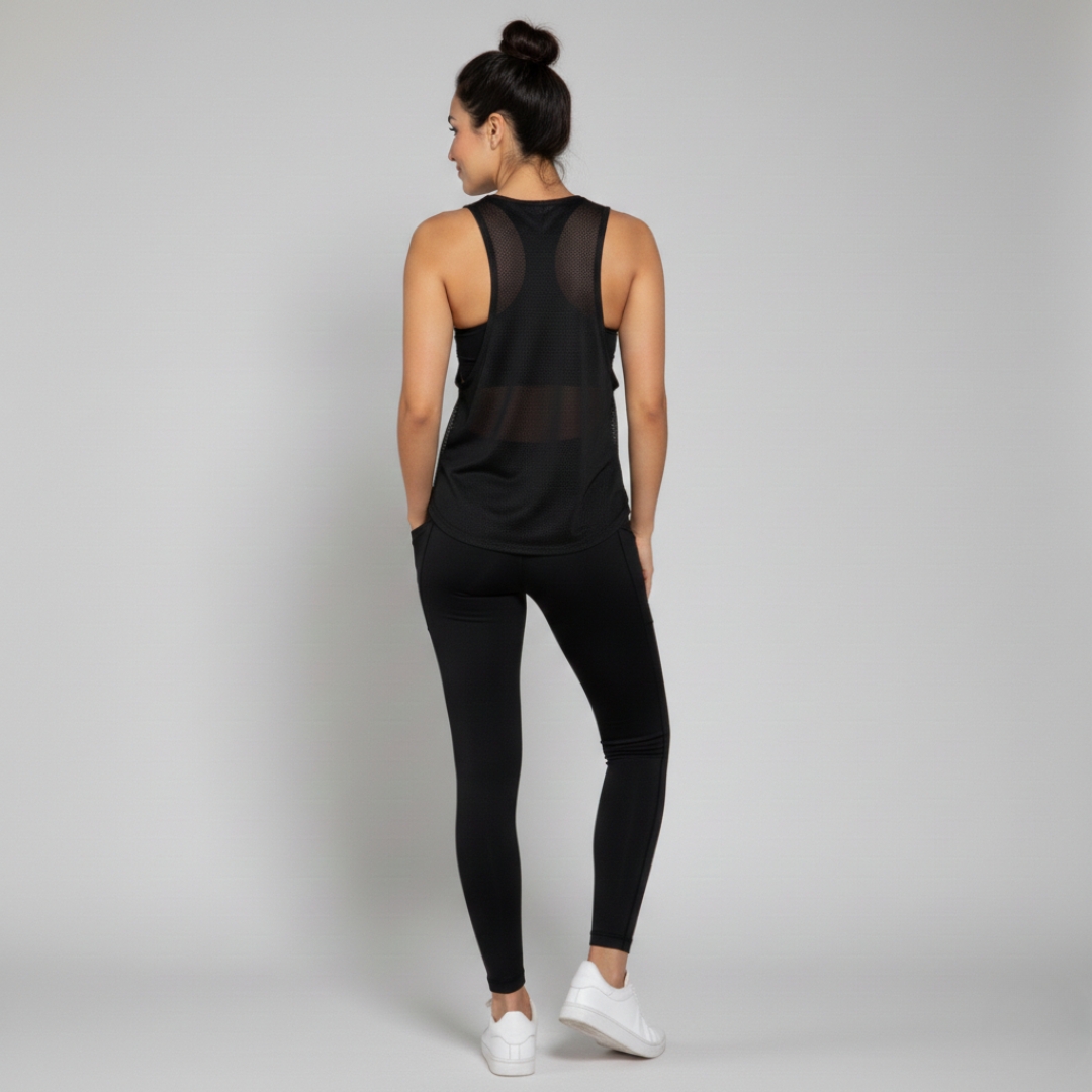 Su corte ergonómico con espalda tipo atleta (racerback) libera las escápulas, permitiendo un rango total de movimiento en ejercicios de fuerza o cardio. Con una silueta ligeramente holgada y un dobladillo redondeado, este esqueleto ofrece una cobertura perfecta sin añadir peso ni volumen, ideal para combinar con tus tops deportivos favoritos.