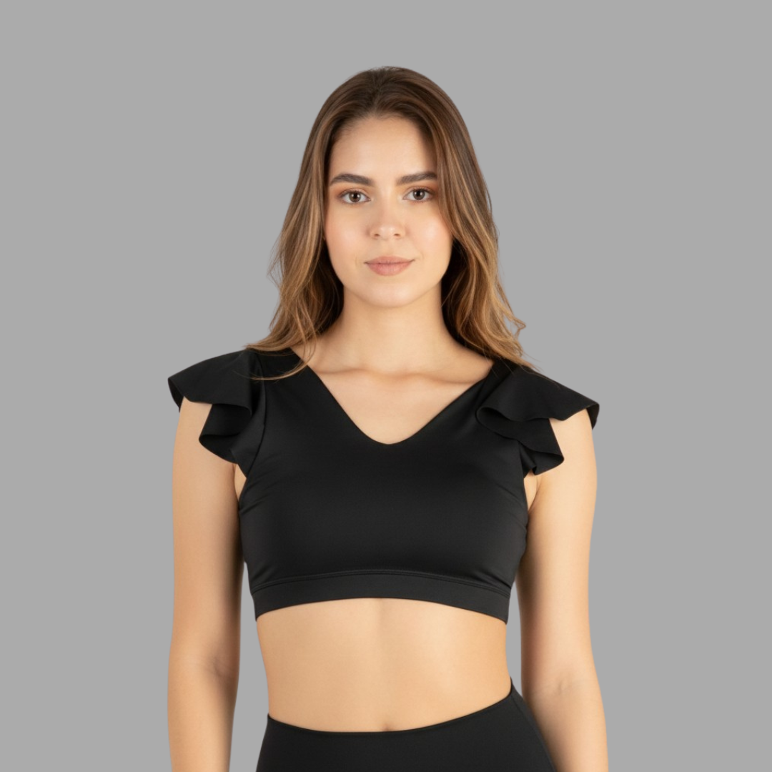 A veces, la ropa de entrenamiento se siente toda igual. Por eso creamos el Top Oliva. Queríamos una prenda que rompiera con la estética plana del gimnasio, añadiendo un toque femenino y diferente a través de sus característicos volantes en las tirantas, pero manteniendo la funcionalidad que necesitas para moverte libremente.